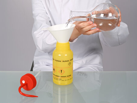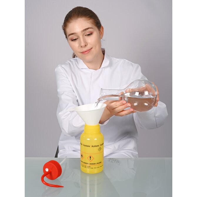 O frasco de lavagem de segurança com válvula de ventilação torna o trabalho quotidiano no laboratório mais fácil e, acima de tudo, mais seguro.