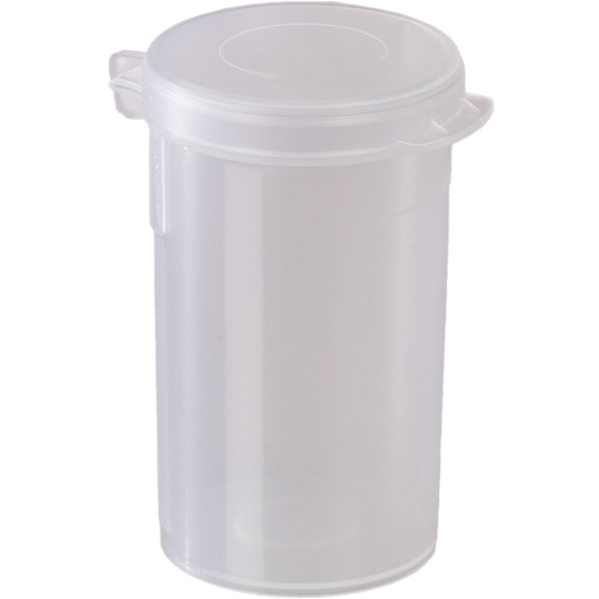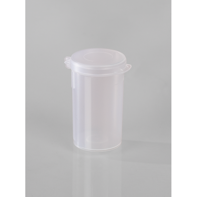 Caixa de amostras com tampa de rosca. Ideal para a recolha e o transporte de amostras. Esvaziamento sem resíduos devido à ausência de fendas.