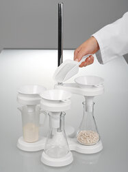 O robusto funil descartável para substâncias em pó é ideal para utilização em laboratórios e salas limpas ou para amostragem. Pode ser utilizado em produtos farmacêuticos, químicos e cosméticos e nas indústrias alimentar e de rações para animais, bem como em todas as áreas onde a pureza especial é importante.