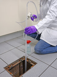 Пробоотборник для отбора проб жидкости с точно заданной глубины, с ручным вакуумным насосом. Преимущество отбора проб с помощью вакуумного насоса заключается в том, что жидкость контактирует только с всасывающим шлангом и оригинальной бутылкой для проб.