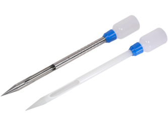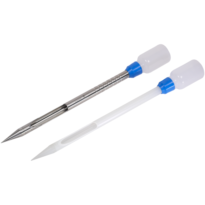 Пробоотборник "СтикПруф" (StickProof) для порошкообразных материалов предназначен для использования в фармацевтическом производстве, изготовлен из нержавеющей стали V4A (1.4404). Его наконечник очень тонок, что позволяет легко вводить пробоотборник в объём материала на достаточную глубину. Коническое отверстие наконечника позволяет отбирать пробы как очень малого, так и большего объёма. Пробоотборник "СтикПруф" (StickProof) является цельным и не имеет стыков, выемок и технологических неровностей, что обеспечивает простоту и высокое качество его очистки. Предусмотрена возможность отбора пробы непосредственно в пакет для образца. Пакет закрепляется с помощью надежного зажима.