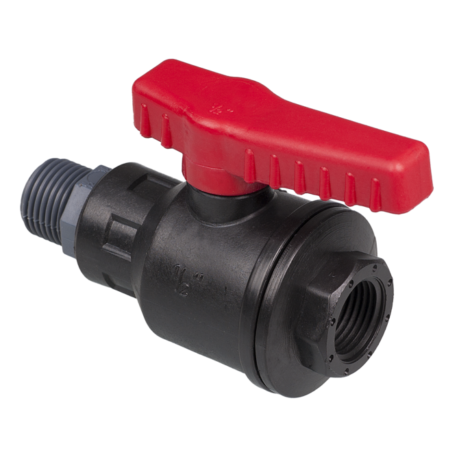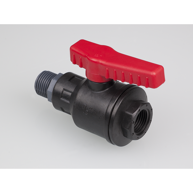 Шаровой кран из полипропилена с наружной резьбой, армированный стекловолокном, шар из полипропилена, ручка с уплотнительным кольцом из безопасного для пищевых продуктов NBR и уплотнением из EPDM.