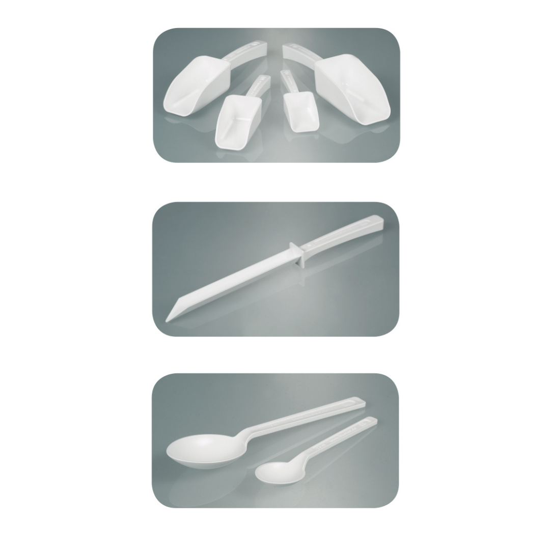 Kavisli kaşık hazneli kaşık, tozlar, granüller, macunlar ve sıvılar dahil olmak üzere çok çeşitli farklı ortamlar için uygundur. Açılı kaşık şekli, bir kabın köşelerine ulaşmak için de iyidir. Plastik kaşığın uzun sapı, büyük kaplardaki kalıntıları kolayca boşaltmayı mümkün kılar ve ayrıca dar boyunlu bidonlar gibi ulaşılması zor yerlere de ulaşabilir.