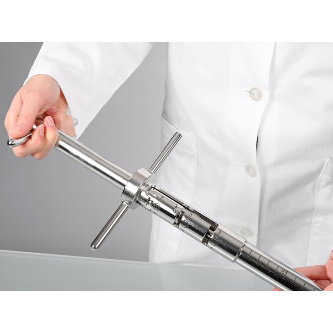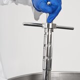 Numune mızrağının daldırma derinliği, lazerle kazınmış derinlik ölçeğinden kolayca okunabilir. Yuvarlatılmış uç kabın çizilmesini önler. İki ek tutamak, malzemeye güvenli bir şekilde yerleştirme, sabitleme ve döndürme sağlar. Tam olarak oturan uçlar malzemelerin karışmasını önler ve kapsamlı temizlik için kolayca sökülmesini sağlar.