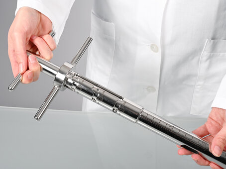 Lazerle oyulmuş derinlik ölçeği sayesinde numune mızrağının daldırma derinliği kolayca okunabilir. Yuvarlatılmış uç, kabın çizilmesini önler. İki ek tutamak, malzemenin güvenli bir şekilde yerleştirilmesini, sabitlenmesini ve döndürülmesini sağlar. Tam olarak oturan uçlar malzemenin karışmasını önler ve kapsamlı temizlik için kolayca sökülmesini sağlar.