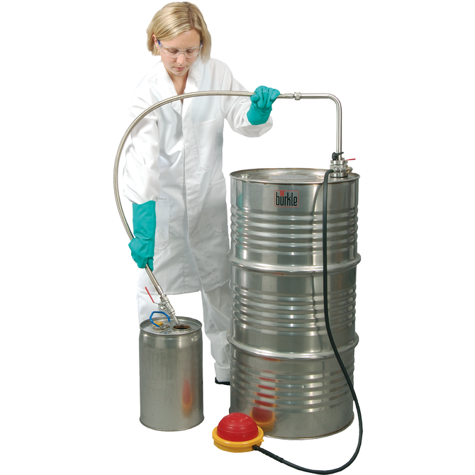 Organik çözücülerin ve aroma maddelerinin kirlenmeden uzaklaştırılması için elle çalıştırılan çözücü pompası. El pompası aşırı basınç prensibine göre çalışır. Pompa bilyesi ile tankta aşırı bir basınç oluşur ve sıvıyı kabın dışına iter.