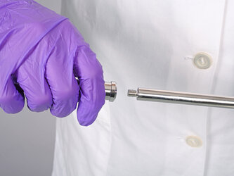 The collection chamber is available in two sizes, suited to the respective volume range of the tips. It features a smooth surface that can be cleaned without residue and sterilised. The collection chamber ensures that the collected powder sample is securely stored until it is analysed and enables rapid volume changes by simply exchanging the tips.