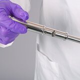 The collection chamber is the sample intake cylinder of the PharmaPicker system. The corresponding volume tip is inserted into the front of this stainless steel chamber. When inserted into the powder, the tip fills up; as it is withdrawn, the sample volume remains in the collection chamber.