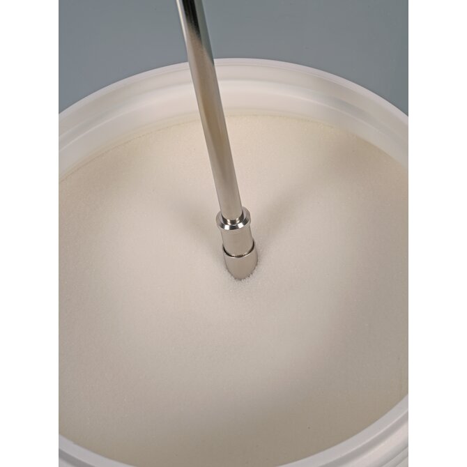 Sampler for powder in the pharma area, made of stainless steel AISI 316L, material 1.4404. The especially slender tip can be inserted easily and deeply in order to take the sample. The conical inlet of the tip allows the collection of either very small or larger quantities. StickProof is constructed in one piece without edges, grooves or crevices for perfect and easy cleaning. The sample can be filled directly into the sampling bag from the outlet end. Fasten the bag with a sturdy clamp.