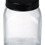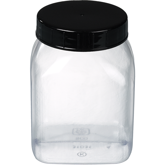 - Wide-mouth jar, square, PVC and black screw cap with foam insert