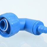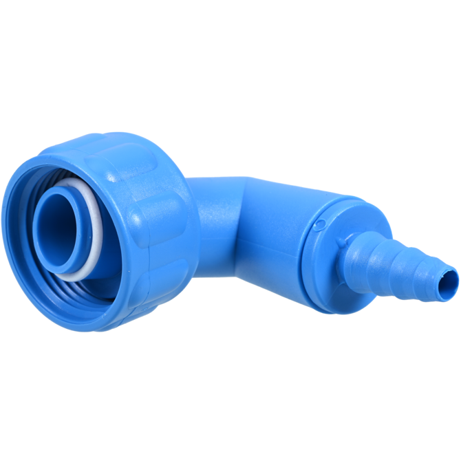 The StopCock outlet angle is a specially designed angled adapter for the Bürkle StopCock drain cock. It is attached to the StopCock tap using a union nut and can be rotated, allowing the outlet to be positioned as desired. Thanks to the raised reducing nozzle (Ø 6–8 mm) at the end of the angle, the liquid flows in a controlled manner, making it possible to fill even small bottle openings without spilling. At the same time, the swiveling angle prevents residual drops from falling uncontrollably—effectively avoiding dripping.