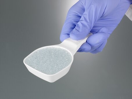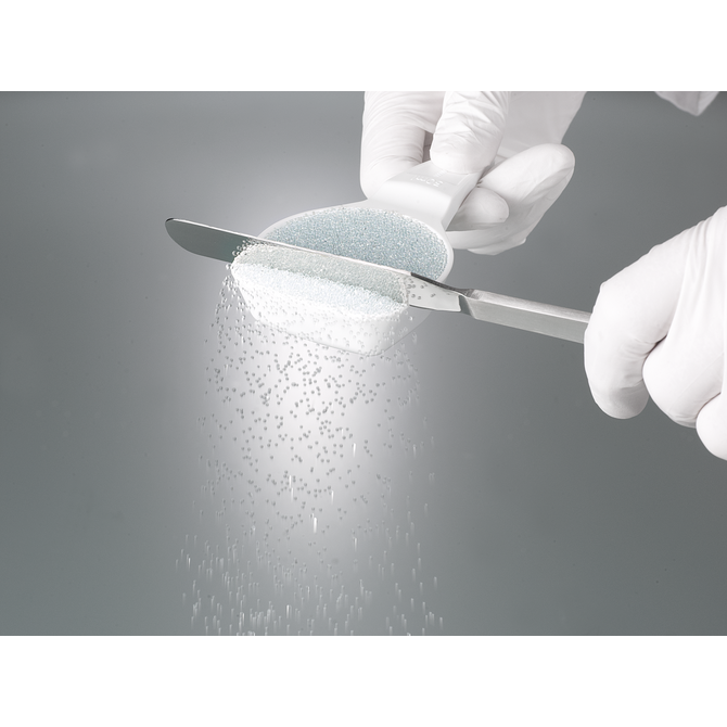 The flat front edge of the volumetric spoon is ideal for picking up medium from the bottom of the container or for getting into the corners of the container, thus allowing for good emptying of small remaining amounts. The flat base makes it possible to set the volumetric spoon down without spilling the content.