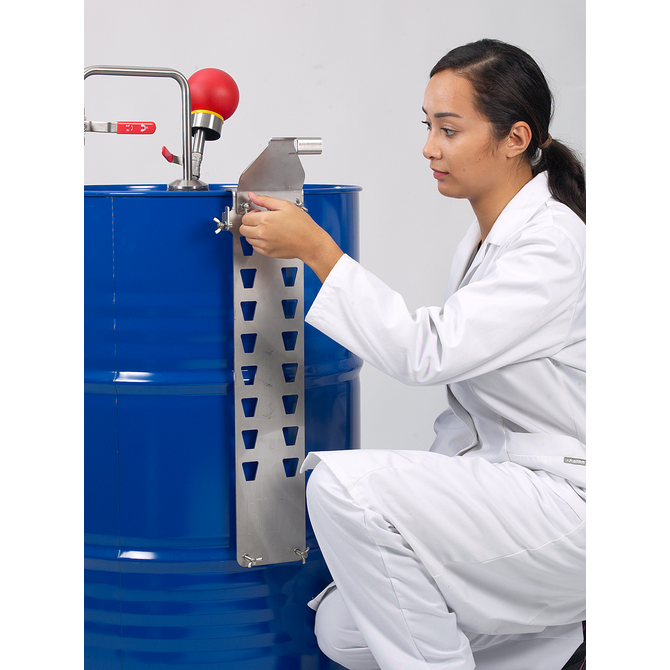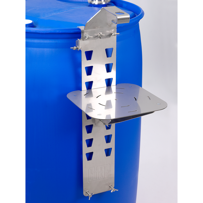 The holder can be used for Bürkle pumps with discharge elbow or discharge hose. Discharge hoses can easily be inserted into the hinged holder. Suitable for all plastic and stainless steel drums from 60 litres to 220 litres with a minimum rim height of 10 mm.