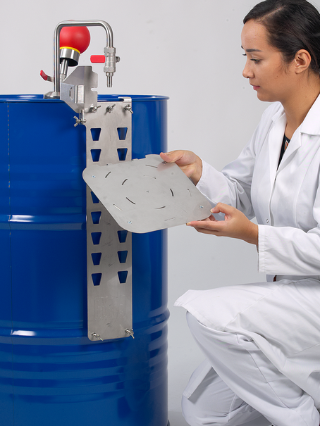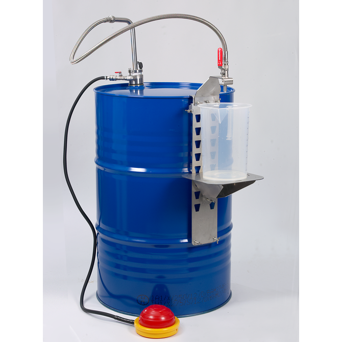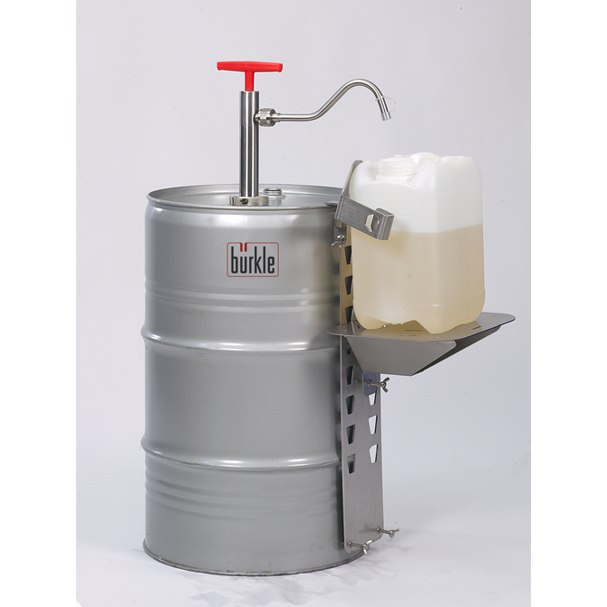 The height-adjustable support surface of the drum support allows the filling containers to be placed directly under the outlet of the drum pump. This eliminates the risk of spillage when filling from a height, such as when the drum is on the floor. In addition, the operator has both hands free during filling and can easily remove larger quantities. A scale and container can also be placed on the support surface to accurately measure the liquid to be filled.