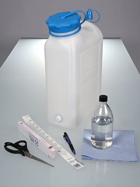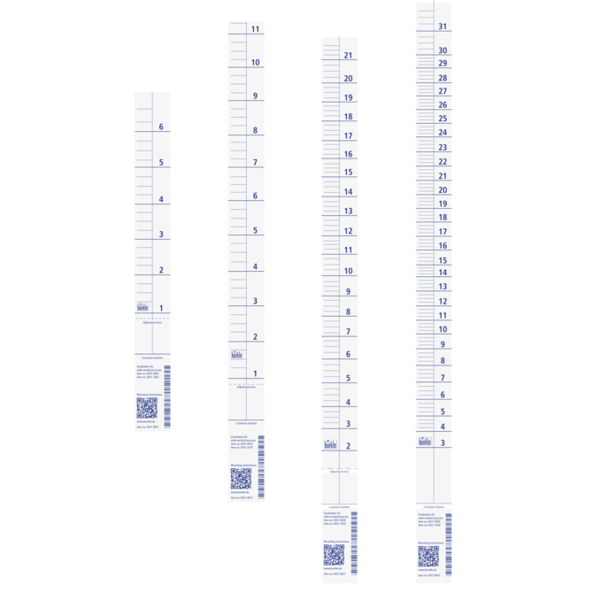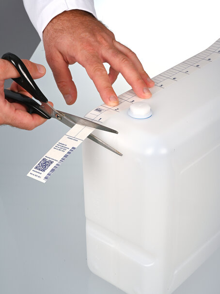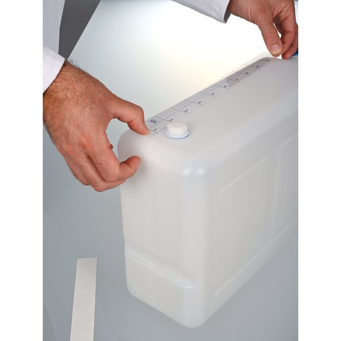 The graduation is designed for easy and quick volume estimation with wide-neck canisters that do not have an integrated scale. It is applied to the outside of the canister and indicates the filled liquid volume in litres – ideal for applications where precise level control is required. The scale is made of durable, chemical-resistant material and adheres reliably to PE and PP surfaces. Application is simple: just stick it onto the clean outer wall of the canister.