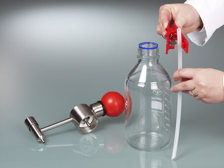 The hand pump has a standard GL 45 connection thread, but can easily be adapted to containers with thread sizes S 40, GL 38 or GL 32 using thread adapters (accessories).