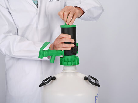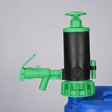 The PumpMaster's integrated tap enables precise dosing of liquids. The tap can be operated to dispense liquid in a targeted manner, or can be opened for flow by folding it forward.