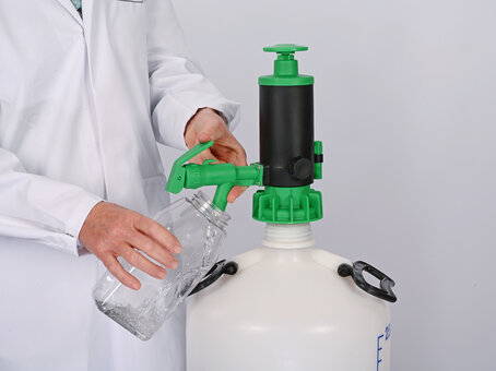 The PumpMaster in green for filling and dosing acids and chemical liquids is equipped with high-quality FKM seals. Ideal for the safe handling of light acids and other chemicals.