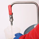 The solvent pump for tinplate canisters with pull-out spout puts an end to the risky decanting of dangerous substances into another container. The included thread adapter fits to the standard pull-out spouts - immediate safety!