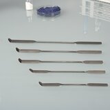 The micro spatula can be used for reliably measuring, sampling or processing small amounts of powder, chemicals, pastes, creams or active ingredients. The laboratory scoop is made of stainless steel and is manufactured entirely without edges, crevices or undercuts. This excludes the possibility of impurities or cross-contamination, since no product residue or cleaning agents can be deposited.