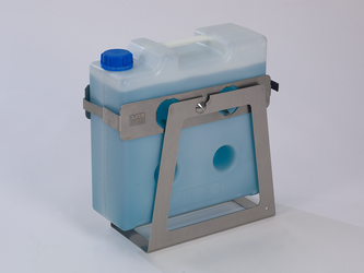 The compact jerrycan sits on the inlets in the holder and is fixed in place with a tightener. That makes it impossible for the container to slip out. The jerrycan can be reliably guided with the swivelling holder and the liquid medium can be dispensed and transferred without expending any great effort.