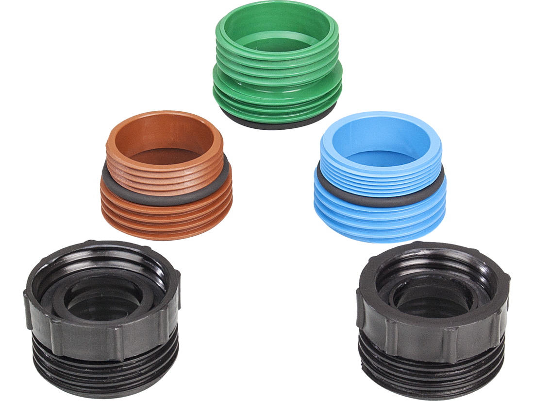 Steel drums usually have standardised threads. This is different for plastic drums and containers, where there are a variety of thread types. We supply suitable adapters for the most common container threads so that outlet taps, pumps and other accessories can be securely fitted.