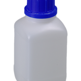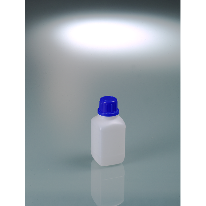 The blue PP tamper evident screw cap with conical seal and tamper evidence ring ensures leak proof storage. The square bottle shape combined with the recessed label area facilitates labeling and organization. The narrow neck allows for precise dispensing and prevents spillage.