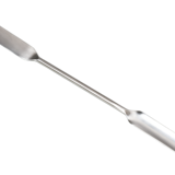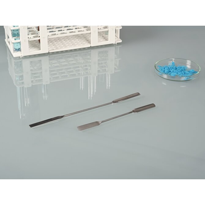 This stainless steel 1.4301 (304) powder spatula combines two sophisticated functional surfaces into one compact tool. It provides maximum control when working with powders, granules, and pasty materials. The half-shell side safely picks up, fills, and doses small quantities of material. The flat side with square edges can be used to precisely smooth, scrape, and distribute materials. These features make the spatula a hygienic, versatile, and robust laboratory tool indispensable for chemical, pharmaceutical, cosmetic, and food technology applications.