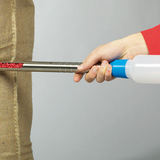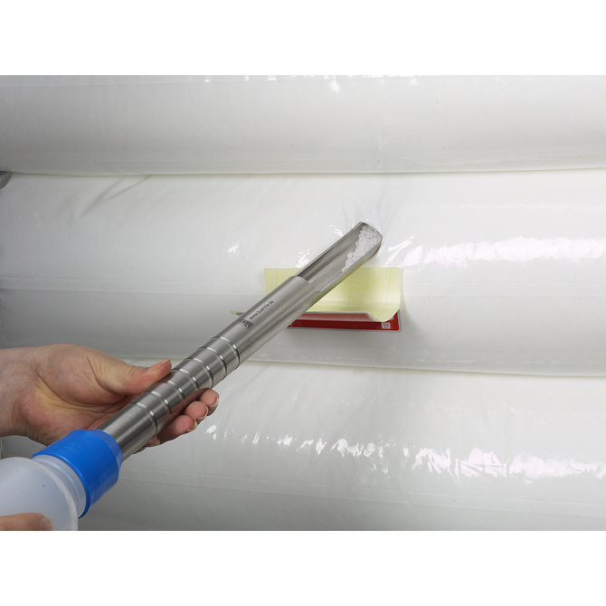Sampler for powder in the pharma area, made of stainless steel AISI 316L, material 1.4404. The especially slender tip can be inserted easily and deeply in order to take the sample. The conical inlet of the tip allows the collection of either very small or larger quantities. StickProof is constructed in one piece without edges, grooves or crevices for perfect and easy cleaning. The sample can be filled directly into the sampling bag from the outlet end. Fasten the bag with a sturdy clamp.