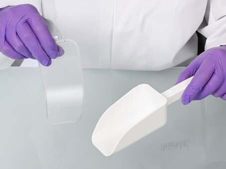 The LaboPlast® disposable scoop made of PS is manufactured under class 7 (ISO) cleanroom conditions, assembled and individually packaged to meet the highest cleanliness requirements. The scoop with transparent lid remains protected even after unpacking.