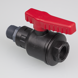 Robinet à bille en PP avec filetage extérieur / intérieur, à renfort en fibre de verre, bille en PP, poignée avec joint torique en NBR apte au contact alimentaire et joint en HDPE.