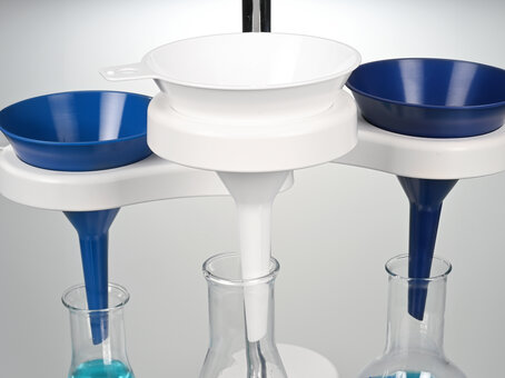 Supporto per imbuti con quattro porta imbuti e quattro inserti riduttori. Un piedistallo molto robusto offre un'area di stoccaggio per quattro contenitori e garantisce un'assoluta sicurezza contro il ribaltamento.