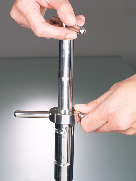La profondità di immersione della lancia di campionamento è facilmente leggibile sulla scala di profondità incisa al laser. La punta arrotondata evita di graffiare il contenitore. Due maniglie aggiuntive garantiscono un inserimento, un fissaggio e una rotazione sicuri nel materiale. Gli inserti di precisione impediscono la miscelazione dei materiali e consentono un facile smontaggio per una pulizia accurata.