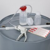 Campionatore per campioni di liquidi da una profondità esattamente predeterminata, con pompa per vuoto manuale. Il campionamento con pompa a vuoto ha il vantaggio che il liquido entra in contatto solo con il tubo di aspirazione e con la bottiglia di campione originale.