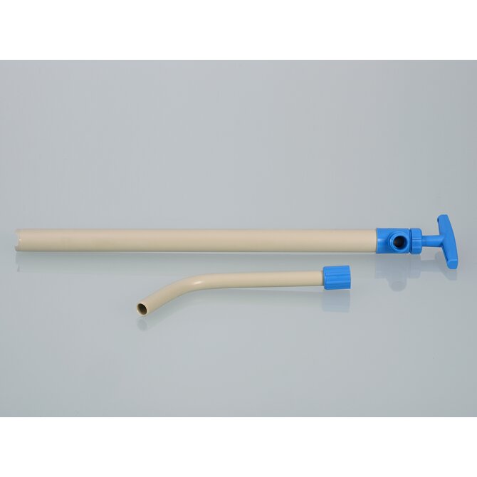 Pompa beczkowa PP z elastycznym wężem tłocznym wykonanym z PVC o długości 1,2 m i zaworem odcinającym.