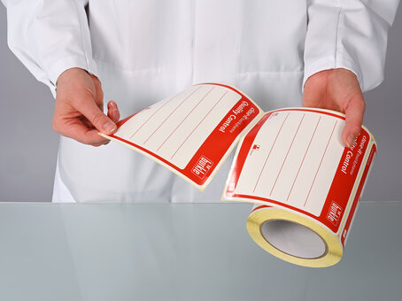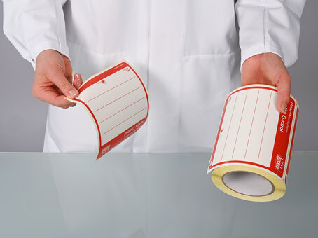 Os rótulos estão disponíveis em diferentes cores. Com impressão em vermelho, azul, verde, amarelo, preto ou neutro (sem impressão em branco).