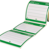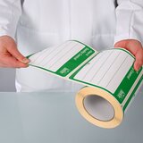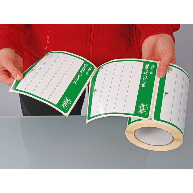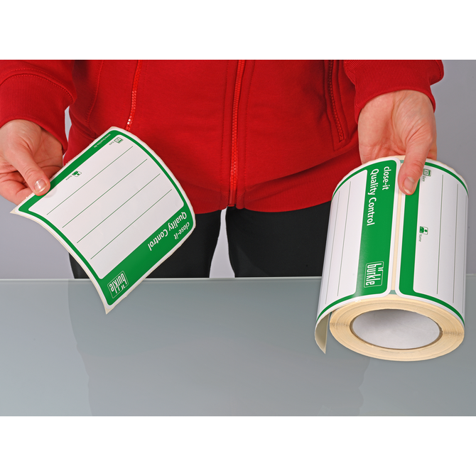A parte posterior da etiqueta é revestida com um adesivo potente. Isso significa que a close-it adere firmemente à maioria dos recipientes comerciais, mesmo em superfícies revestidas com pó fino, levemente úmidas ou até mesmo em superfícies congeladas, onde as etiquetas convencionais ou a fita adesiva não aderem.