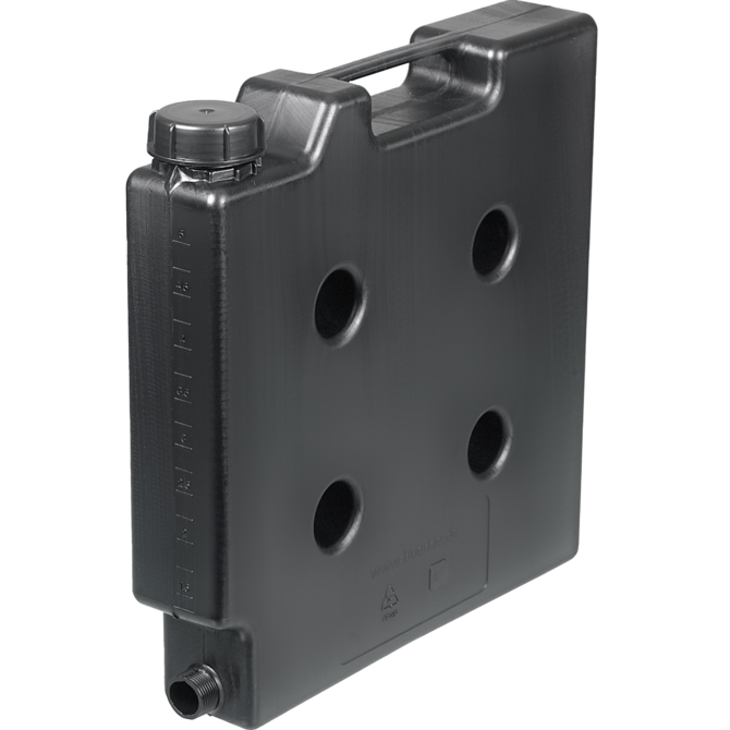 O recipiente compacto com conexão rosqueada de 3/4 pol. permite o armazenamento com economia de espaço, bem como o manuseio conveniente do líquido, por exemplo, o enchimento direto de líquidos.