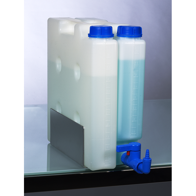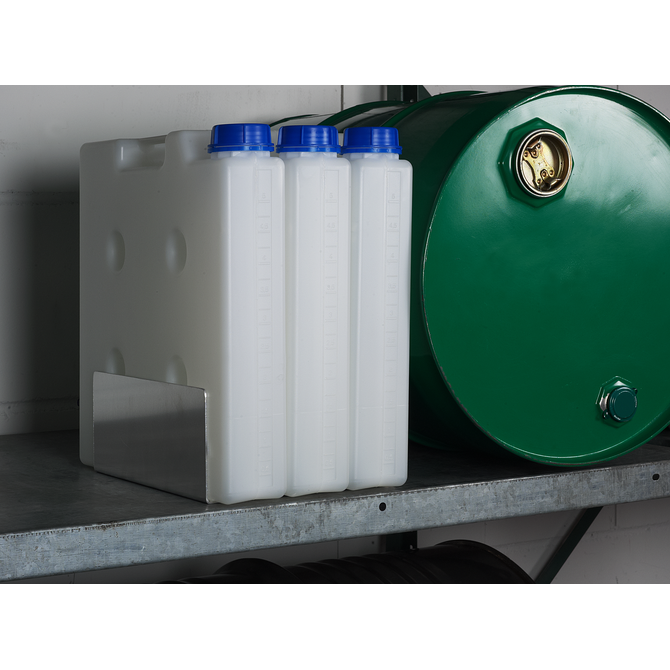 As duas abas altas ("paredes") do suporte envolvem as laterais estreitas do recipiente, evitando que ele escorregue ou tombe para os lados. Especialmente em prateleiras, em veículos ou em ambientes com vibrações, como laboratórios ou oficinas, o suporte mantém o recipiente em posição segura.