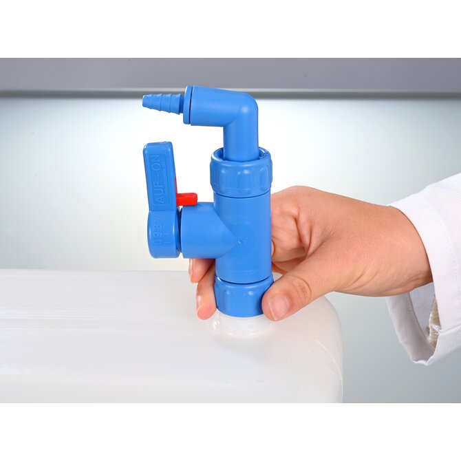 Os bocais de mangueira StopCock são conexões de saída especiais que podem ser parafusadas na torneira de drenagem Bürkle StopCock. Eles permitem que uma mangueira seja conectada diretamente à torneira para direcionar os líquidos com precisão para recipientes posicionados em locais mais distantes. Os bocais de mangueira estão disponíveis em vários tamanhos nominais para corresponder aos diâmetros internos correspondentes da mangueira. Eles são quimicamente resistentes e dimensionalmente estáveis. A montagem é feita com uma porca de união na rosca externa de ¾″ do StopCock. Uma mangueira de distribuição pode então ser fixada com segurança. Com os bicos da mangueira, o líquido flui diretamente e sem perdas por gotejamento da torneira do tambor para, por exemplo, garrafas, galões ou por distâncias maiores.