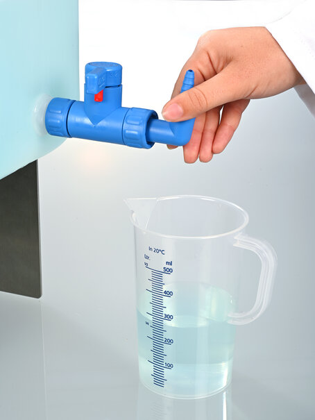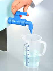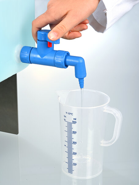O ângulo de saída StopCock é um adaptador angular especialmente projetado para a torneira de drenagem Bürkle StopCock. Ele é fixado à torneira StopCock usando uma porca de união e pode ser girado, permitindo que a saída seja posicionada como desejado. Graças ao bocal redutor elevado (Ø 6-8 mm) na extremidade do ângulo, o líquido flui de forma controlada, possibilitando encher até mesmo pequenas aberturas de garrafas sem derramar. Ao mesmo tempo, o ângulo giratório evita que gotas residuais caiam sem controle, evitando efetivamente o gotejamento.