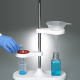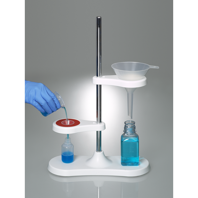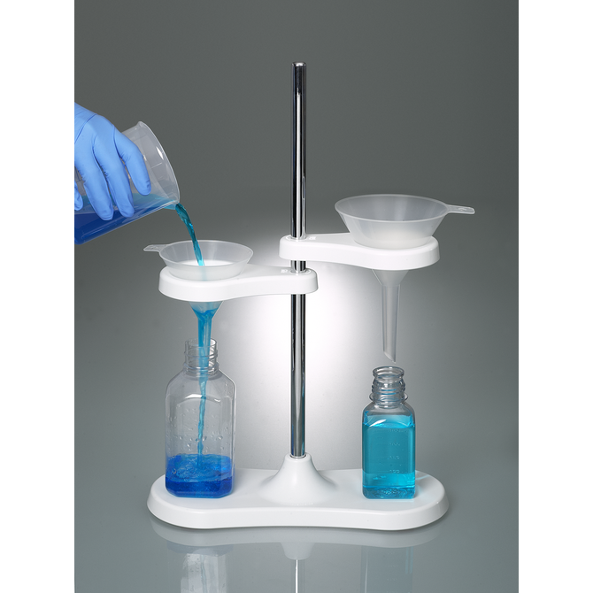 Suporte de funil robusto e estável, resistente a produtos químicos, à prova de estilhaços e com ajuste de altura continuamente variável.