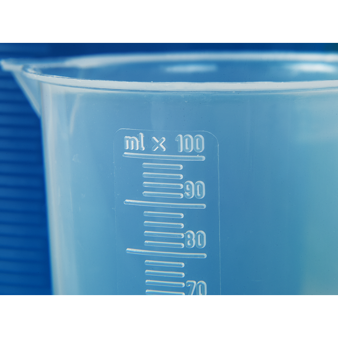 Copo graduado com graduação impressa em azul, pega aberta, cónico. Os copos podem ser empilhados, poupando assim espaço durante o armazenamento.