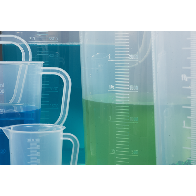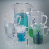 Copos graduados universais com graduação indestrutível. Os três bicos especialmente formados permitem verter facilmente os líquidos.