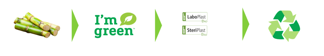 LaboPlast® Os produtos biológicos são produzidos numa sala limpa a partir de matérias-primas renováveis, enquanto o SteriPlast® Bio são adicionalmente esterilizados com raios gama. O bio-PE, que é 100% reciclável e feito de pelo menos 94% de matérias-primas não fósseis, não só contribui para a redução das emissões de CO2 Toda a nossa gama de produtos biológicos possui a certificação My Green Lab ACT.