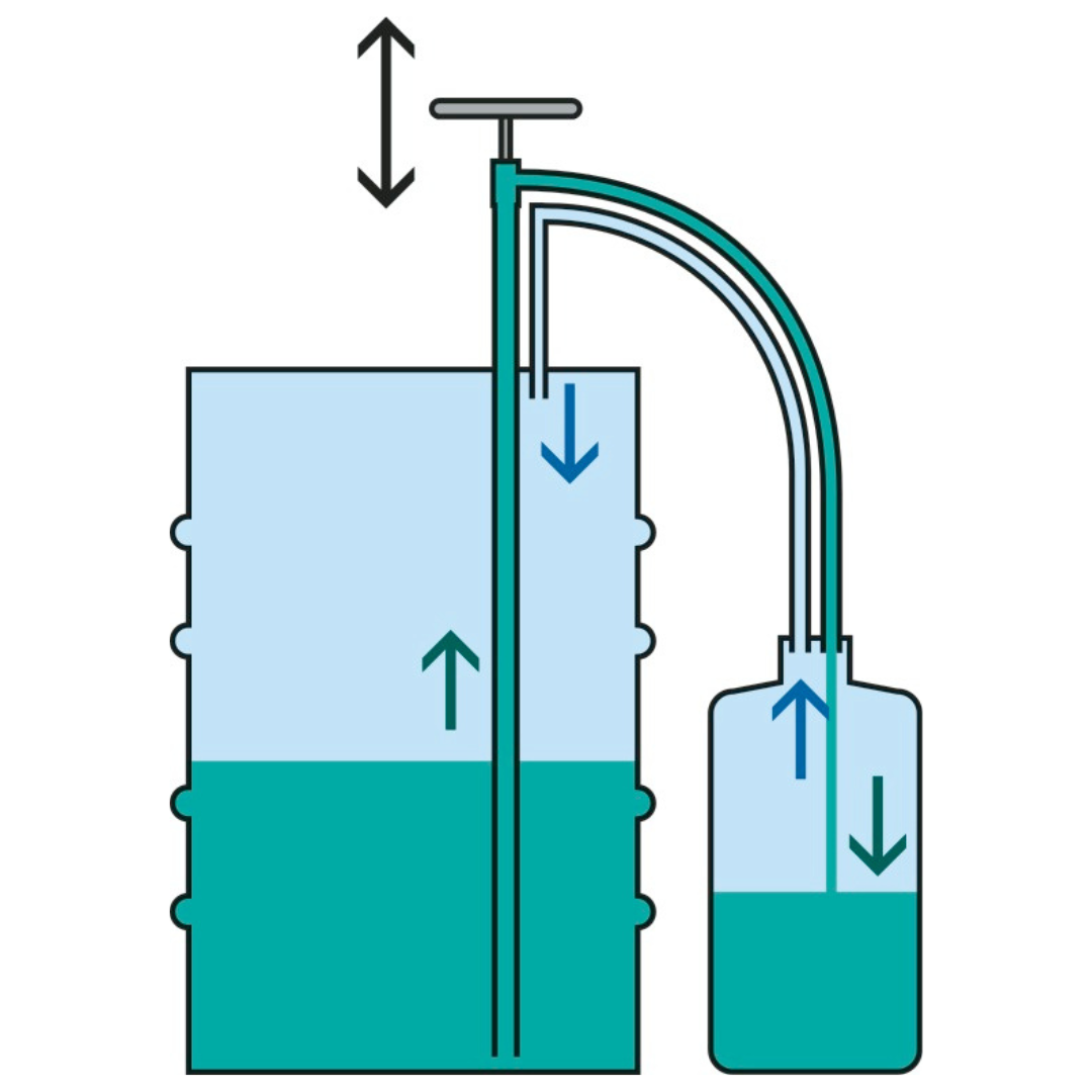 As bombas que funcionam de acordo com o princípio do excesso de pressão são adequadas para encher as quantidades necessárias de bidões e tambores. O ar é bombeado para dentro do recipiente através de uma esfera de bombeamento ou de um pistão de bombeamento. Isto cria um excesso de pressão no recipiente e o líquido é transportado para fora através do tubo de imersão.