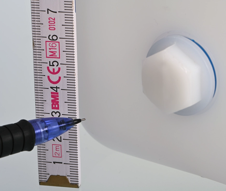 A escala é auto-adesiva e pode ser fixada em qualquer parte do jerrycan. No entanto, recomenda-se que a escala seja fixada na parte lateral do bocal de saída.