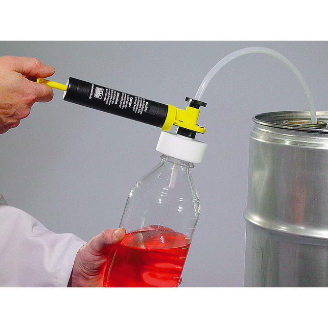 Ручной насос создаёт вакуум при вытягивании поршня, что позволяет засасывать жидкости с глубины до 5 м. Адаптер из полипропилена (внутренняя резьба GL 32) даёт возможность напрямую подключить пробирочную бутылку к насосу – таким образом, отобранная проба сразу поступает в приёмный сосуд. В вакуумном пробоотборнике MiniSampler жидкость соприкасается только с всасывающим шлангом и оригинальной пробирочной бутылкой, что в значительной степени исключает перекрёстное загрязнение.