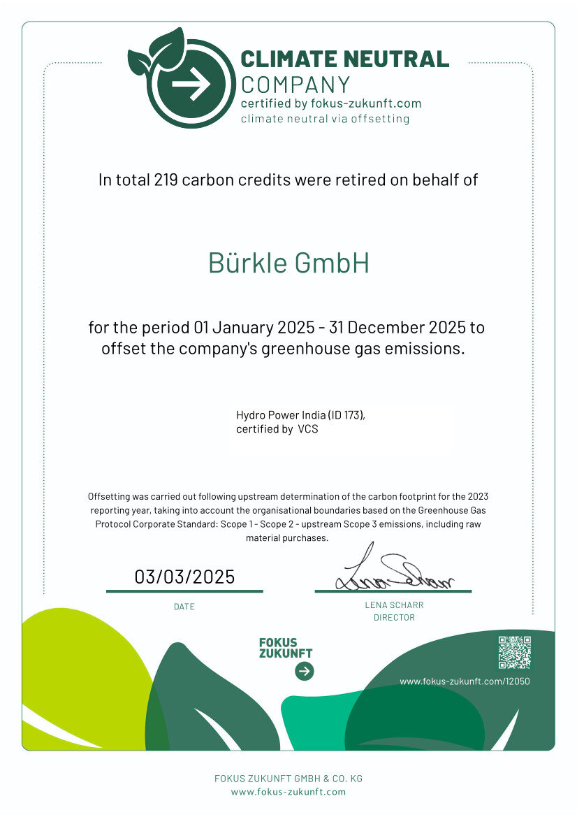 Kaynakların sürdürülebilir kullanımı, emisyonların azaltılması ve iklim projelerinin desteklenmesi sayesinde Fokus Zukunft tarafından İklim Nötr Şirket olarak sertifikalandırıldık. Bu, sürdürülebilir bir şekilde hareket ettiğimiz ve CO2 Bürkle'deki çalışmalarımız sırasında saldığımız emisyonlar. İklim Nötr Şirket sertifikası, sürdürülebilir eylem sağlamak ve çevremizi korumak için bizim için belirleyici bir adımdır.