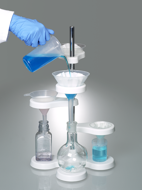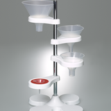 Huni standı, 40 ila 180 mm çapındaki tüm huniler için uygundur. Huni tutucular, küçük huniler için küçültücü uçlarla kullanılabilir.